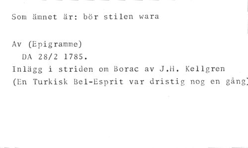 Som ämnet är: bär stilen wara //// Av (Epigramme) //// DA 28/2 1785. //// Inlägg i striden om Borac av J.H. Kellgren //// (En Turkisk Bel-Esprit var dristig nog en gång: