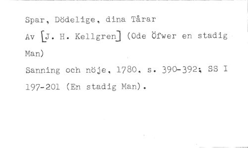 Spar, Dödelige, dina Tårar //// Av U. H. Kellgren] (Ode Öfwer en stadig Man) //// Sanning och nöje, 1780, s. 390-392; SS I 197-201 (En stadig Man).