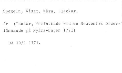 Spegeln,. Wisar. Wåra. Fläckar. //// Av (Tankar, författade wid en Souvenirs öfwer-' lämnande på Nyårs-Dagen 1771) //// DA 10/1 1771.