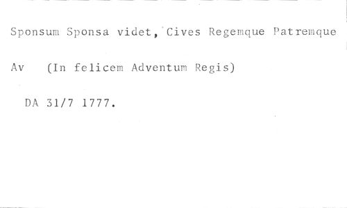 Sponsum Sponsa videt,'Cives Regemque Patremque //// Av (In felicem Adventum Regis) //// DA 31/7 1777.