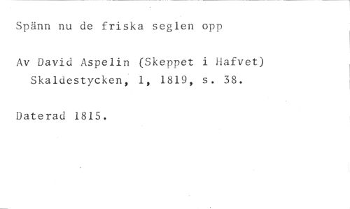 Spänn nu de friska seglen opp //// Av David Aspelin (Skeppet i iafvet) Skaldestycken, 1, 1819, s. 38. //// Daterad 1815.
