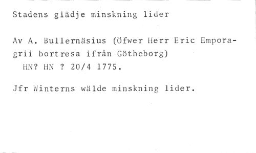 Stadens glädje minskning lider //// Av A. Bullernäsius ()fwer Herr Eric Emporagrii bortresa ifrån Götheborg) HN? HN ? 20/4 1775. //// Jfr alinterns wälde minskning lider.