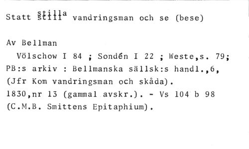 Statt Mila vandringsman och se (bese) //// Av Bellman //// Völschow I 84 ; Sond6n I 22 ; Weste,s. 79; PB:s arkiv : Bellmanska sällsk:s handl.,6, (Jfr Kom vandringsman och skåda). //// 1830,nr 13 (gammal avskr.). - Vs 104 b 98 (C.M.B. Smittens Epitaphium).