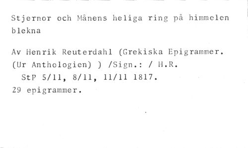 Stjernor och Månens heliga ring på himmelen blekna //// Av Henrik Reuterdahl (Grekiska Epigrammer. (Ur Anthologien) ) /Sign.: / H.R. //// StP 5/11, 8/11, 11/11 1817. //// 29 epigrammer.