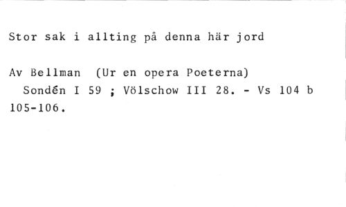 Stor sak i allting på denna här jord //// Av Bellman (Ur en opera Poeterna) //// Sond6n I 59 ; Völschow III 28. - Vs 104 b 105-106.