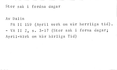 Stor sak i fordna dagar //// Av Dalin //// PÅ II 159 (April verk om vår herrliga tid). - VA II 2, s. 3-17 (Stor sak i forna dagar; April-Wärk om tuår härliga Tid)