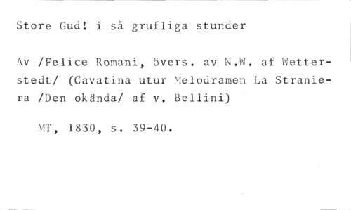 Store Gud! i så grufliga stunder //// Av /Felice Romani, övers. av N.W. af Wetterstedt/ (Cavatina utur Melodramen La Straniera /Den okända/ af v. Bellini) //// MT, 1830, s. 39-40.