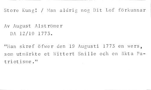Store Kung! / Man aldrig nog Dit Lof förkunnar //// Av August Alströmer DA 12/10 1773. //// "Han skref öfwer den 19 Augusti 1773 en wers, som utmärkte et Wittert Snille och en äkta Patriotisme."