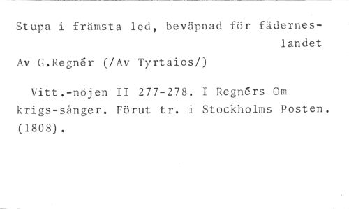 Stupa i främsta led, beväpnad för fädernes- //// landet //// Av G.Regn6r (/Av Tyrtaios/) //// Vitt.-nöjen II 277-278. I Regn6rs Om krigs-sånger. Förut tr. i Stockholms Posten. (1808).