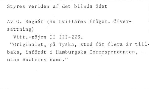 Styres verlden af det blinda ödet //// Av G. Regner (En tviflares frågor. Öfversättning) //// Vitt.-nöjen II 222-223. //// "Originalet, på Tyska, stod för flera år tillbaka, infördt i Hamburgska Correspondenten, utan Auctorns namn."