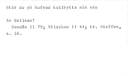 Står du pä hufvud kullhytta min vän //// Av Bellman? //// Sond6n II 79; Völschow II 64; tr. Steffen, s. 50.