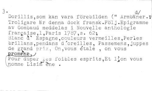 3 • d //// /Dorillislsom kan vara förebilden (" Armbäner.v1 Troligare är denna dock fransk.Följ.Epigramrne av Gombaud meddelas i Nouvelle anthologie franzaise,l,Paris 1787,s. 62; //// Blanc V Espagne,couleurs vermeilles,Perles brillans,pendans d'oreilles, Passemens,juppes de grand priy, On,vous etale , on vous //// olgaA //// Pour auper les foibles espritslEt lon vous nomme Lisirnne .