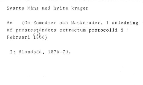 Svarta Måns med hvita kragen //// Av (Om Komedier och Maskerader. I anledning //// af presteståndets extractum protocolli i - Februari ig4) //// I: Blandsäd, 1876-79.
