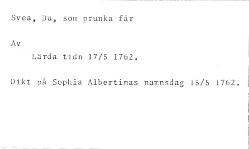 Svea, som prunka får //// Lärda tidn 17/5 1762. //// Av //// Dikt på Sophia Albertinas namnsdag 15/5 1762.