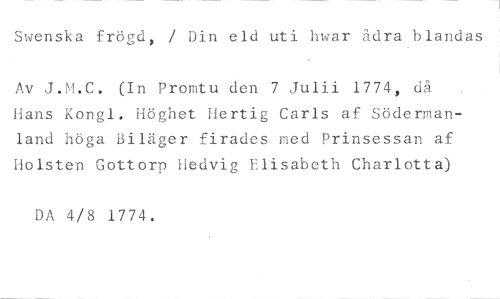Swenska frögd, / Din eld uti hwar ådra blandas //// Av J.M.C. (In Promtu den 7 Juni 1774, då Hans Kongl. Höghet Hertig Carls af Södermanland höga Biläger firades med Prinsessan af Holsten Gottorp Hedvig Elisabeth Charlotta) //// DA 4/8 1774.