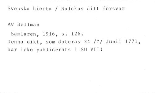 Svenska hierta / Nalckas ditt försvar Av Bellman //// Samlaren, 1916, s. 126. //// Denna dikt, som dateras 24 /?/ Junii 1771, har icke publicerats i SU VII!