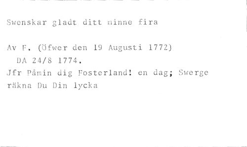 Swenskar gladt ditt minne fira //// Av F. (Öfwer den 19 Augusti 1772) //// DA 24/8 1774. //// Jfr Pårnin dig Fosterland! en dag; Swerge räkna Du Din lycka