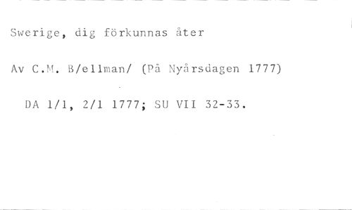 Swerige, dig förkunnas åter //// Av C.M. B/ellman/ (På Nyårsdagen 1777) DA 1/1, 2/1 1777; SU VII 32-33.