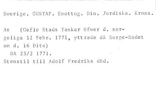 Swerige. GUSTAF. Emottog. Din. Jordiska. Krona. //// Av (Gefle Stads Tankar öfwer d. sor- //// geliga 12 Febr. 1771, yttrade då Sorge-Bodet //// om d. 16 Dito) DA 23/2 1771. //// Stenstil till Adolf Fredriks död.