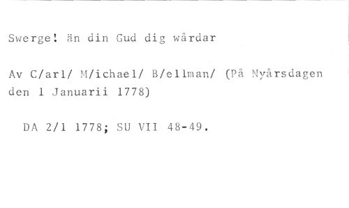 Swerge! än din Gud dig wårdar //// Av C/arl/ M/ichael/ B/ellman/ (På Nyårsdagen den 1 Januarii 1778) //// DA 2/1 1778; SU VII 48-49.