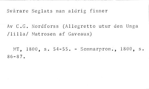 Svårare Seglats man aldrig finner //// Av C.G. Nordforss (Allegretto utur den Unga /lilla/ Matrosen af Gaveaux) //// MT, 1800, s. 54-55. - Sommarprov., 1800, s. 86-87.