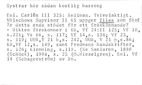 Systrar hör sådan kostlig bassong //// Enl. Carl6n III 325: Bellman. Tvivelaktigt. Völschows Supvisor II 65 uppger Tilas som förf Är detta enda stödet för ett frånkännande? - Dikten förekommer i KB, Vf 24:11 125; Vf 10, s.221; Vs 66, s. 117; Vf 14,s. 138; Vf 23, s. 119; UUB,V 21 b,s. 242, UUB, V 21 p,s.86; KB,Vf 12,s. 149, samt Fredmans handskrifter, s. 126; Klemming, s.119. (Se Samlaren, 1880 (Schack), 1908, s. 25 (0.Wieselgren). Enl. Vf 14 (Schagerström) av Bn.
