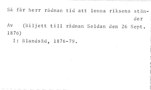 Sä får herr rådman tid att lemna riksens stän- //// der //// Av (Biljett till rådman Seldan den 26 Sept. //// 1876) //// I: Blandsäd, 1876-79.