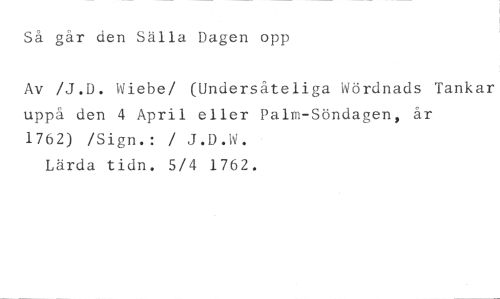 Så går den Sälla Dagen opp //// Av /J.D. Wiebe/ (Undersåteliga Wördnads Tankar uppå den 4 April eller Palm-Söndagen, år //// 1762) /Sign.: / J.D.W. Lärda tidn. 5/4 1762.