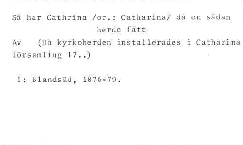 Så har Cathrina /or.: Catharina/ då en sådan herde fått //// Av (Då kyrkoherden installerades i Catharina //// församling 17..) //// I: Blandsäd, 1876-79.