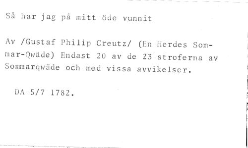 Så har jag på mitt öde vunnit //// Av /Gustaf Philip Creutz/ (En Herdes Sommar-Qwäde) Endast 20 av de 23 stroferna av Sommarqwäde och med vissa avvikelser. //// DA 5/7 1782.