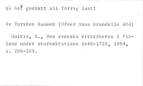 Så haY godnatt all förrig lust: //// Av Torsten Rudeen (Öfver Anna Brundells död) //// Bultin, A., Den svenska vitterheten i Finland under stormaktstiden 1640-1720, 1904, s. 206-209.