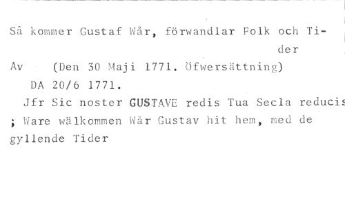 Så kommer Gustaf Wår, förwandlar Folk och Ti- //// der //// Av (Den 30 Maji 1771, Öfwersättning) //// DA 20/6 1771. //// Jfr Sic noster GUSTAVE redis Tua Secia reduci5 ; Ware wälkommen Wår Gustav hit hem, med de gyllende Tider