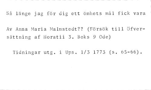 Så länge jag för dig ett ömhets mål fick vara //// Av Anna Maria Malmstedt?? (Försök till Jfversättning af Horatii 3. Boks 9 Ode) //// Tidningar utg. i Ups. 1/3 1773 (s. 65-66).