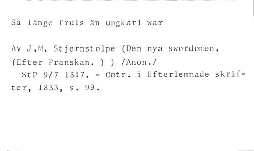 Så länge Truls än ungkarl war //// Av J.M. Stjernstolpe (Den nya swordomen. (Efter Franskan. ) ) /Anon. //// /StP 9/7 1817. - Omtr. i Efterlemnade skrifter, 1833, s. 99.