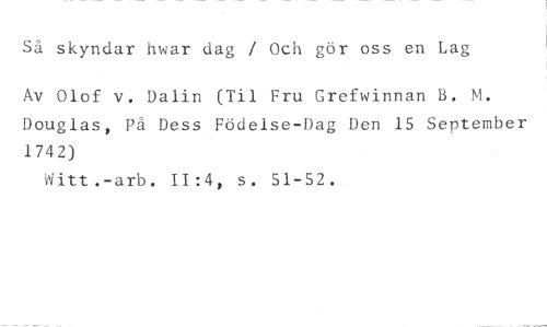Så skyndar hovar dag / Och gör oss en Lag //// Av Olof v. Dalin (Til Fru Grefwinnan B. M. Douglas, På Dess Födelse-Dag Den 15 September 1742) //// Witt.-aria. 11:4, s. 51-52.