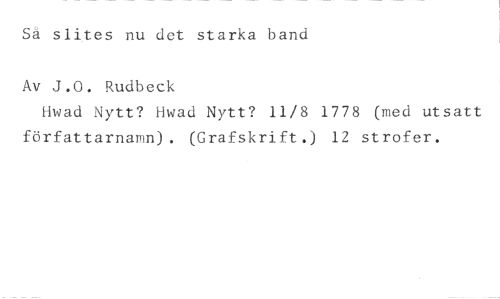 Så slites nu det starka band //// Av J.0. Rudbeck //// Hwad Nytt? Hwad Nytt? 11/8 1778 (med utsatt författarnamn). (Grafskrift.) 12 strofer.