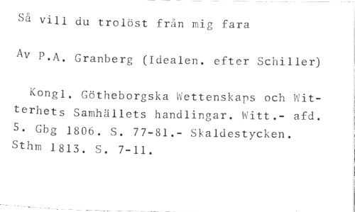 Si vill du trolöst från mig fara //// Av P.A. Granberg (Idealen. efter Schiller) //// Kongl. Götheborgska Wettenskaps och Witterhets Samhällets handlingar. Witt.- afd. 5. Gbg 1806. S. 77-81.- Skaldestycken. Sthm 1813. S. 7-11.