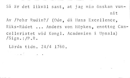 Så är det likväl sant, at jag min önskan vun- //// nit //// Av /Pehr Rudin?/ (Ode, då hans Excellence, Riks-Rådet ... Anders von Höpken, emottog Can- //// celleriatet wid Kongl. Academien i Upsala) /Sign.:/P.R. //// Lärda tidn. 24/4 1760.