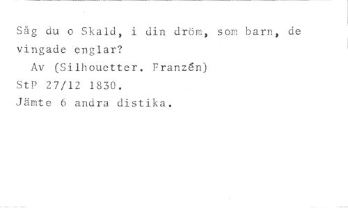 Såg du o Skald, i din dröm, som barn, de //// vingade englar? //// Av (Silhouetter. Franzén) //// StP 27/12 1830. //// Jämte 6 andra distika.