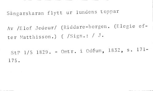 Sångarskaran flytt ur lundens toppar //// Av /Elof Jedeur/ (Riddare-borgen. (Elegie efter Matthisson.) ( /Sign.: / J. //// StP 1/5 1829. - Omtr. i Od6ur, 1832, s. 171175.