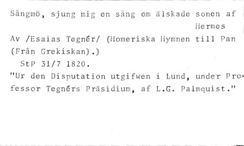 Sångmö, sjung mig en säng om älskade sonen af //// lermes //// Av /Esaias Tegn6r/ (Homeriska Hymnen till Pan (Från Grekiskan).) //// StP 31/7 1820. //// "Ur den Disputation utgifwen i Lund, under Professor Tegnérs Präsidium, af L.G. Palmquist."
