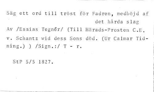 Såg ett ord till tröst för Fadren, medböjd af //// det hårda slag //// Av /Esaias Tegner/ (Till Härads-Prosten C.E. //// v. Schantz wid dess Sons död. (Ur Calmar Tidning.) ) /Sign.:/ T - r. //// StP 5/5 1827.