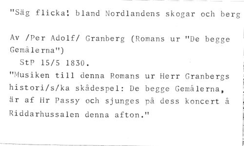 "Säg flicka! bland Nordlandens skogar och berg //// Av /Per Adolf/ Granberg (Romans ur "De begge Gemälerna") //// StP 15/5 1830. //// "Musiken till denna Romans ur Herr Granbergs histori/s/ka skådespel: De begge Gemålerna, är af Hr Passy och sjunges på dess koncert å //// Riddarhussalen denna afton."