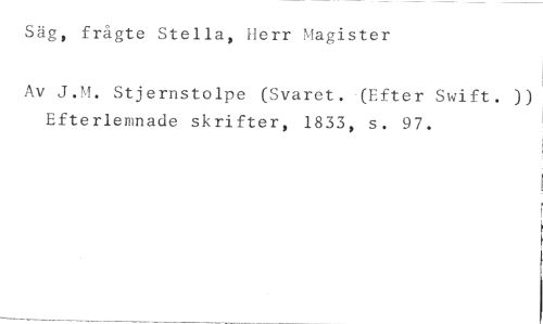 Säg, frägte Stella, Herr Magister //// Av J.M. Stjernstolpe (Svaret. (Efter Swift. )) Efterlemnade skrifter, 1833, s. 97.