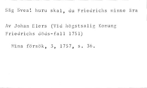 Säg Svea: huru skal, du Friedrichs minne ära //// Av Johan Elers (Vid högstsalig Konung Friedrichs döds-fall 1751) //// Mina försök, 3, 1757, s. 36.