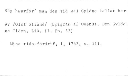 Säg hwarför' man den Tid wäl Gyldne kallat har //// Av /Olof Strand/ (Epigram af Owenus. Den Gylde ne Tiden. LiB. II. Ep. 53) //// Mina tids-fördrif, 1, 1763, s. 111.