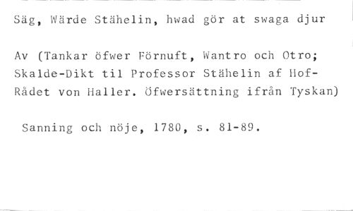 Säg, Wärde Stähelin, hwad gör at swaga djur //// Av (Tankar öfwer Förnuft, Wantro och Otro; Skalde-Dikt til Professor Stähelin af Hof-Rådet von Haller. Öfwersättning ifrån Tyskan) //// Sanning och nöje, 1780, s. 81-89.