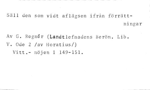 Säll den som vidt aflägsen ifrån förrätt- //// ningar //// Av G. Regn6r (bandtlefnadens Beröm. Lib. V. Ode 2 /av Horatius/) Vitt.- nöjen I 149-151.