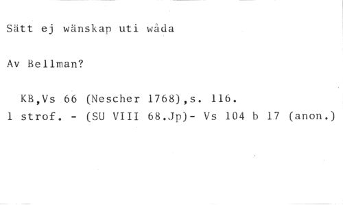Sätt ej wänskap uti wäda //// Av Bellman? //// KB,Vs 66 (Nescher 1768),s. 116. //// 1 strof. - (SU VIII 68.Jp)- Vs 104 b 17 (anon.)