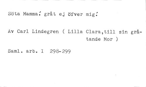 Söta Mamma: gråt ej öfver mig: //// Av Carl Lindegren ( Lilla Clara,till sin grå- //// tande Mor ) //// Saml. arb. I 298-299